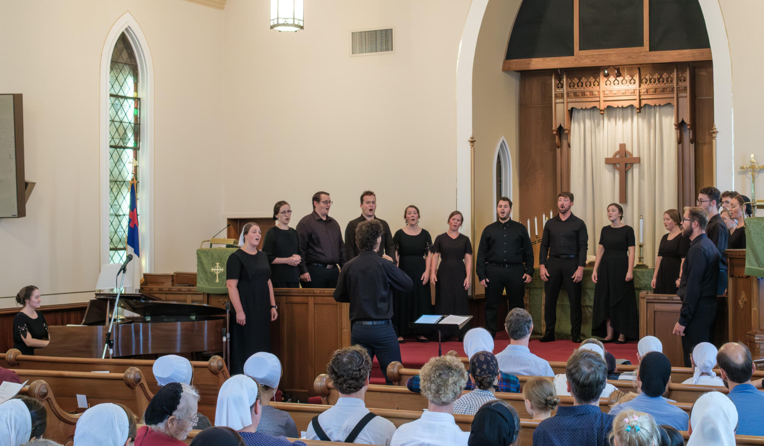 Tuesday was the first day of Canticle rehearsal! We arrived at Messiah around 9:00 and gathered ourselves, music, and water bottles in the front of the sanctuary. Maestro Yutzy led us in a vigorous warmups. (VvvvvvvvvvvvvvvvVVVVAAHHHHHHHH) and then we hit the repertoire.At one point in the morning we got to serenade the Messiah sewing circle, who smiled at us graciously over their quilts and wanted to know our parents’ names.Jotham, our wonderful manager, provided us richly all things to enjoy at break times (“There’s coffee tea and donuts out there!”) which, added to the delicious lunch provided by Holmes County locals, kept us energized all day long.Finally at 5:00 we were done and nearly spent, so we did a little cleanup and headed to East Main for dinner. The conversation was lively and the food did not disappoint. We headed home to listen to some recordings from the day and fall into our soft soft beds.– Annalisa Byler [Soprano]